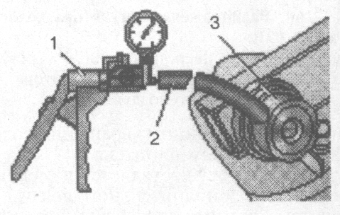 Рис. 2-169. Проверка работоспособности топливных форсунок на снятой топливной рейке: А и В - направление потоков топлива 8. При помощи проводов подавать попеременно в течение 30 секунд напряжение 12 В на форсунки ("+" подается на контакт штекерный вывод форсунки, а "−" - на корпус топливной рейки двигателя). Проверить пропускную способность форсунок. Из форсунки должен исходить сильный непрерывный факел топлива, имеющий форму конуса с однородной структурой (без отдельных капель). Форсунка имеет неразборную конструкцию, поэтому при наличии неисправности ее необходимо заменить. Демонтировать форсунку можно не снимая топливную рейку с двигателя. Для этого достаточно отсоединить штекерную колодку форсунки, снять фиксатор и аккуратно, стараясь не повредить уплотнительные резиновые кольца, вынуть форсунку из гнезда в топливной рейке. Регулятор давления проверяют способом, аналогичным проверке топливного насоса, подсоединив к топливной рейке двигателя манометр, а вместо шланга от воздушного ресивера подсоединить вакуумный насос (рис. 2-170). Установив перемычку (см. рис. 2-163), включить топливный насос. Создать вакуумным насосом 1 (см. рис. 2-170) разрежение 0,05 МПа (0,5 кгс/см2). Если регулятор давления исправен, давление топлива в системе должно снизиться на то же значение.