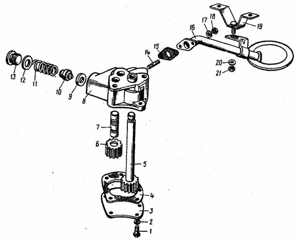Рис. 2-55. Масляный насос и маслоприемник двигателя ВАЗ: 1 - болт крепления крышки насоса; 2 - шайба; 3 - крышка насоса; 4 - прокладка крышки насоса; 5 - валик с ведущей шестерней; 6 - ведомая шестерня; 7 - ось ведомой шестерни; 8 - корпус насоса; 9 - седло клапана; 10 - редукционный клапан; 11 - пружина редукционного клапана; 12 - прокладка пробки; 13 - пробка; 14 - шпилька крепления маслоприемника; 15 - прокладка фланца маслоприемника; 16 - маслоприемник; 17 - пружинная шайба; 18 - гайка крепления маслоприемника; 19 - верхний кронштейн крепления маслоприемника; 20 - коническая шайба; 21 - гайка Проверка деталей насоса После разборки все детали насоса следует промыть керосином или бензином, продуть струей сжатого воздуха, а затем осмотреть корпус и крышку насоса; при наличии трещин детали заменить. Проверить набором щупов зазоры между зубьями шестерен, а также между наружными диаметрами шестерен и стенками корпуса насоса (рис. 2-56), которые должны быть соответственно 0,15 мм (предельно допустимый 0,25 мм) и 0,11-0,18 мм (предельно допустимый 0,25 мм). Если зазоры превышают предельные значения, то заменить шестерни, а при необходимости и корпус насоса. Щупом и линейкой проверить выступание шестерен за плоскость корпуса насоса (рис. 2-57). Оно должно быть равно 0,05-0,135 мм (минимально допустимое 0,02 мм). Если выступание меньше 0,02 мм, заменить шестерни или корпус насоса, в зависимости от того, что подверглось износу. Измерив детали, определить зазор между ведомой шестерной и ее осью, который должен быть 0,017-0,057 мм (предельно допустимый 0,1 мм), а также между валиком насоса, и отверстием втулки корпуса, который должен быть 0,016-0,055 мм (предельно допустимый 0,15 мм). Если зазоры превышают предельные значения, заменить изношенные детали.