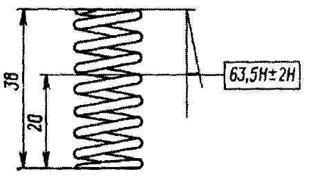 Рис. 2-58. Основные данные для проверки пружины редукционного клапана ВАЗ Проверка редукционного клапана При ремонте масляного насоса проверить редукционный клапан. Обратить внимание на поверхности клапана и корпуса, так как возможные загрязнения или отложения на сопрягаемых поверхностях могут привести к заеданию. На сопрягаемой поверхности клапана не должно быть забоин и заусенцев, которые могут привести к уменьшению давления в системе. Проверить упругость пружины редукционного клапана, сравнивая полученные данные с приведенными на рис. 2-58. Валик и шестерня привода масляного насоса На опорных поверхностях валика и на рабочих поверхностях шестерен не должно быть вмятин и рисок. На зубьях шестерен привода масляного насоса и распределителя зажигания не допускаются выкрашивания, при их наличии - заменить валик или шестерню. Втулки валика привода масляного насоса Проверить внутренний диаметр втулок, их запрессовку в гнездах, а также совпадение смазочного отверстия в передней втулке с каналом в блоке цилиндров (наличие проворачивания втулки). Внутренняя поверхность должна быть гладкой и без задиров. Измерив диаметры валика и втулок, определить зазоры между втулками и опорными поверхностями валика. Если зазор превышает 0,15 мм (предельный износ), а также если поверхность втулок повреждена или ослабла их запрессовка, заменить втулки. Для снятия и установки втулок при их замене следует пользоваться оправкой А.60333/1/2 (рис. 2-59), соблюдая следующее: - втулки должны быть запрессованы в гнезда, при этом отверстие для масла в передней втулке должно находиться против канала в блоке цилиндров; - втулки после запрессовки должны быть окончательно обработаны и доведены по внутреннему диаметру (см. табл. 2-3). Чтобы обеспечить полную соосность втулок вала, для их доводки применяется развертка А.90353, которой одновременно обрабатываются обе втулки.