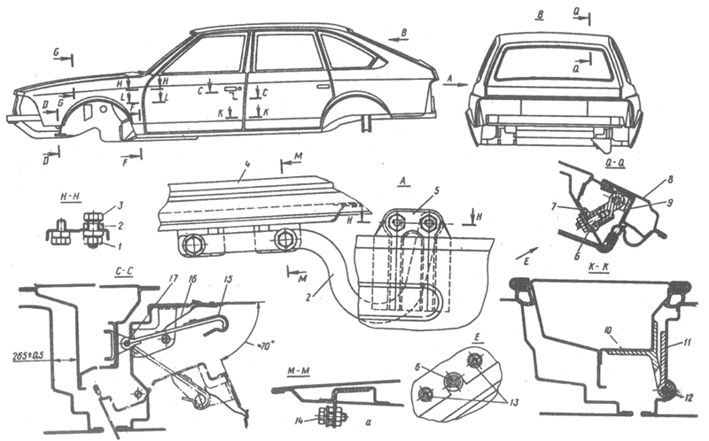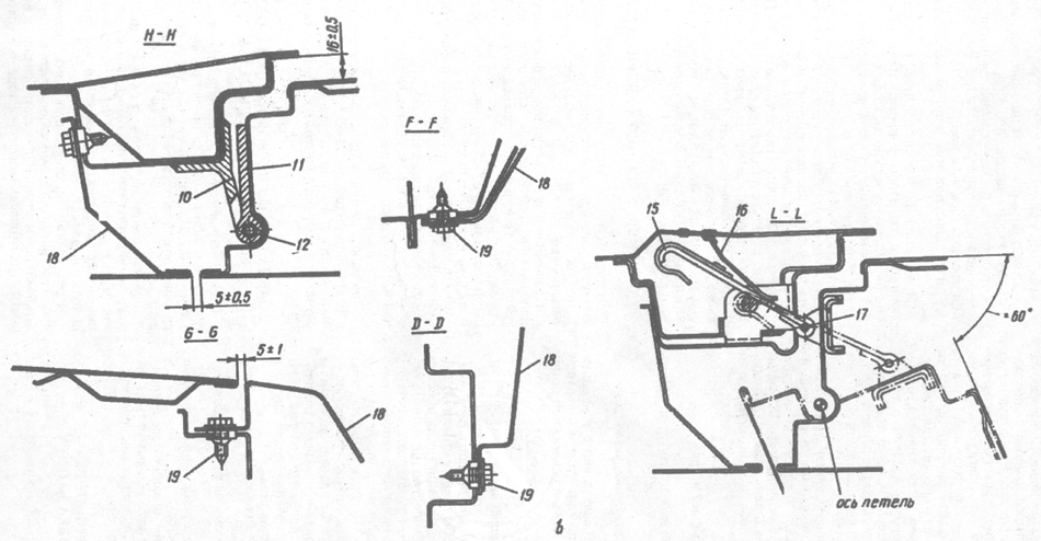 Рис. 8-40. a-b. Фрагменты сечений кузова: а - по боковым дверям и двери задка; b - по капоту и передним крыльям: 1 - контргайка; 2 - подвижная часть петли капота; 3 - болт-ось петли капота; 4 - капот; 5 - неподвижная часть петли капота; 6 - болт; 7 - неподвижная часть петли двери задка; 8 - дверь задка; 9 - подвижная часть петли двери задка; 10 - неподвижное звено петли; 11 - подвижное звано петли; 12 - ось петли; 13 - гайки; 14 - болт крепления петли капота; 15 - ограничитель открытия двери; 16 - направляющая пружины ограничителя; 17 - ось ограничителя; 18 - переднее крыло; 19 - болты крепления переднего крыла Боковые двери вращаются на петлях, звенья которых приварены дуговой сваркой: неподвижное 7 (рис. 8-40) к стойкам боковины, подвижное 9 - к дверям. Оба звена петель соединены между собой съемной свертной, упругой осью 12, запрессованной в отверстия звеньев. Приварка петель обеспечивает точное и стабильное положение дверей в проемах кузова в течение значительного периода эксплуатации автомобиля. Однако в процессе длительной эксплуатации автомобиля, из-за деформации деталей кузова и дверей, изменяется положение двери относительно проема, что затрудняет ее закрывание и открывание. Для регулировки боковых дверей (уменьшения возросшего усилия открывания и закрывания) необходимо восстановить прежнее взаимное положение защелки наружного замка путем перемещения защелки. Для этого ослабить затяжку резьбовой части защелки, отвернув ее на несколько оборотов, после чего перемещением защелки добейтесь такого ее положения, когда будет обеспечено легкое вхождение защелки в паз наружного замка, и вновь затянуть резьбовое соединение. При значительных повреждениях двери, когда их устранение невозможно произвести на навешенной двери, дверь необходимо снять с кузова. Для этого нужно отсоединить ограничитель 15 открывания двери и выбить из петель их оси 12 (отсоединять ограничитель не обязательно при снятии задних дверей). Снятие передней двери Снятие передней двери необходимо производить в следующем порядке: - открыть дверь; - срубить или срезать замыкающую головку оси 17 ограничителя; - поддерживая дверь (желательно с помощником), выбить оси петель, при этом ось верхней петли следует выбивать вниз, а ось нижней петли вверх; - снять дверь. Снятие задней двери При этой операции можно оставить ограничитель на кузове, сняв как бы дверь с ограничителя, но это сопряжено со значительной трудоемкостью и риском сломать направляющую пружину 16 ограничителя, которую в этом случае предстоит снять с двери. Поэтому рекомендуем все же отсоединить ограничитель от кузова, срезав замыкающую головку оси 17 ограничителя. Порядок операций съема задней двери такой же, как и при съеме передней. Перед установкой отремонтированной двери на кузов нужно изготовить ремонтную ось ограничителя. Размеры этой оси приведены на рис. 8-41. Материалом для ее изготовления может служить прутковая малоуглеродистая сталь.