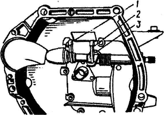 Рис. 3-20. Снятие и установка вала выключения сцепления: 1 - рычаг вала; 2 - пружина вала; 3 - вал Установка вала выключения сцепления в картер