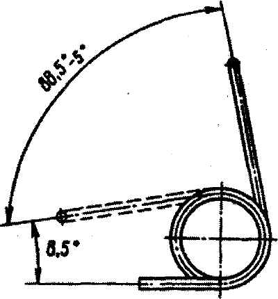 Рис. 3-21. Пружина вала выключения сцепления Перед установкой вала в картер сцепления надо осмотреть большую и малую пластмассовые втулки вала и при необходимости осторожно зачистить заусенцы на их торцах. Проверить, не ослабла ли пружина вала выключения сцепления (рис. 3-21). Проверку пружины следует производить в соответствии с данными табл. 3-3. При необходимости пружину заменить. Нанести тонкий слой свежей смазки ЛСЦ-15 на трущиеся поверхности: вала и его рычагов, большой и малой пластмассовых втулок, направляющей втулки подшипника выключения сцепления и фланца подшипника. До установки вала выключения сцепления в картер надеть пружину 15 (см. рис. 3-1) на вал со стороны его шлицевого конца и установить малую пластмассовую втулку 11 вала с внутренней стороны картера сцепления. Установку вала в картер необходимо производить в следующем порядке: - пропустить вал, подсобранный с пружиной, через отверстие под большую пластмассовую втулку, как показано на рис. 3-20; - установить короткий конец вала в малую втулку при повернутых вверх рычагах 1 (см. рис. 3-19), затем, поворачивая вал вокруг оси, ввести затылочную часть рычага 2 в паз фиксатора 3 вала; - надеть большую пластмассовую втулку на выступающий из картера конец вала и установить ее в отверстие картера, зафиксировав от проворота выступами на фланце втулки в соответствующих пазах в картере; - совместить метку А (рис. 3-22) на торце вала с серединой прорези наружного рычага 1; - напрессовать рычаг 1 (рис. 3-23) ударами молотка на шлицевой конец вала, выдержав размер А от торца вала до рычага равным 11,5-12 мм. При напрессовке рычага вал следует зафиксировать в осевом направлении с помощью упорной оправки 80-П199, воспринимающей усилие напрессовки; - установить болт 18 (см. рис. 3-1) крепления рычага, шайбу 20, гайку 21 так, чтобы головка болта была зафиксирована ступенчатым вырезом на верхнем торце рычага; - затянуть гайку; момент затяжки 15-20 Н·м (1,5-2,0 кгс·м); - установить подшипник 6 выключения сцепления с кожухом в сборе в картер сцепления, как указано выше.