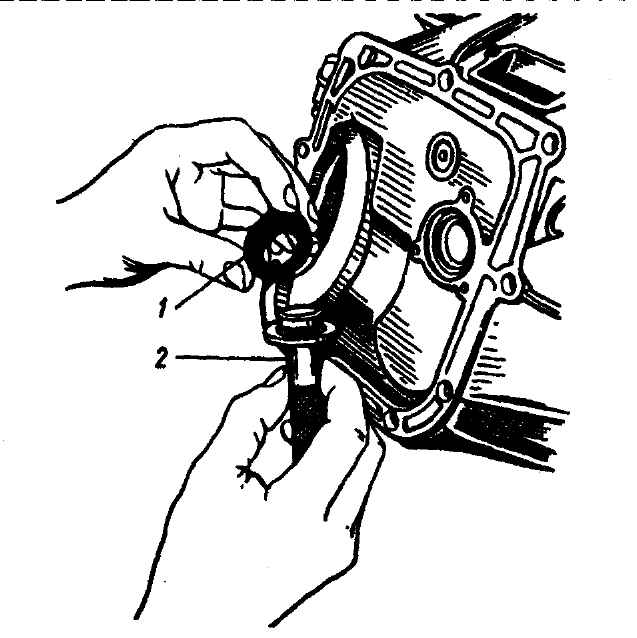 Рис. 3-31. Установка манжеты первичного вала коробки передач на оправку: 1 - манжета; 2 - оправка 80-П106