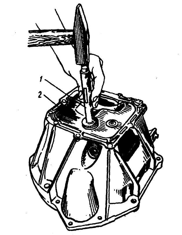 Рис. 3-32. Запрессовка манжеты первичного вала коробки передач в картер сцепления: 1 - оправка 80-П106; 2 - картер сцепления |