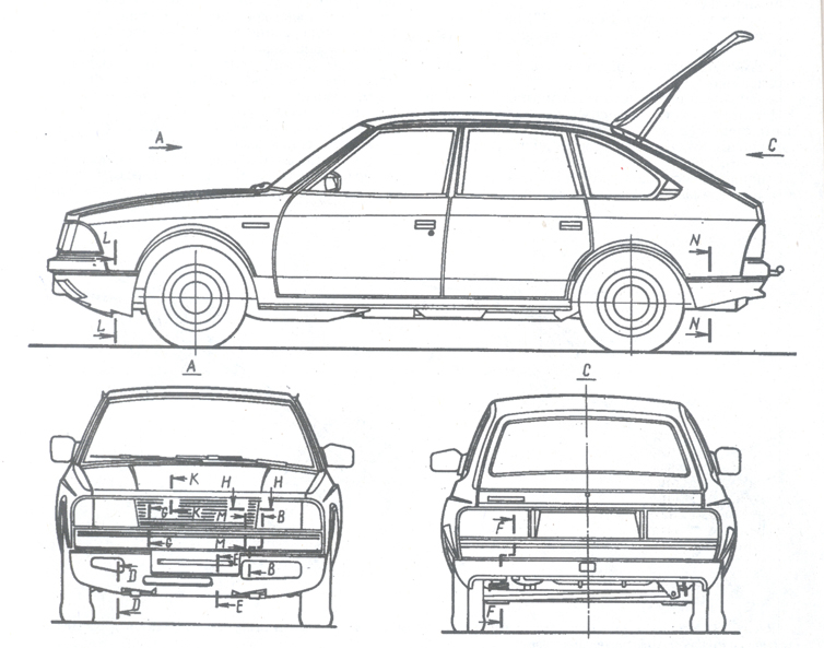 Рис. 8-44. Кузов автомобиля с нанесенными сечениями, изображение которых дано на рис. 8-45 и 8-46