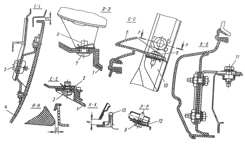 Замена облицовки радиатораНа рис. 8-44 дано изображение кузова с нанесенными сечениями по облицовке радиатора, переднему и заднему буферам с изображением их сечений на рис. 8-45 и рис. 8-46. Изображенные сечения дают представление о конструкции узлов и их крепления к кузову. Пластмассовая облицовка радиатора 8 (см. рис. 8-45) крепится к кузову в девяти местах: верхняя часть облицовки крепится четырьмя скобами 13 к верхней поперечине мотоотсека, нижняя часть - двумя самонарезающими винтами 9 к правому 10 и левому кронштейнам облицовки радиатора; кронштейны в свою очередь крепятся: правый - двумя такими же винтами, а левый - одним к передним стойкам мотоотсека кузова. Снизу к облицовке радиатора через декоративный кант примыкает передний буфер 4. Для снятия облицовки радиатора с кузова достаточно вывернуть два нижних самонарезающих винта 9 и снять четыре скобы 13 верхнего крепления.