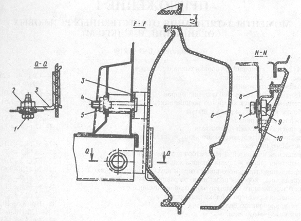 Рис. 8-46. Установка заднего буфера: 1, 7 - болты; 2 - приварная гайка; 3, 10 - кронштейны буфера; 4 - приварной болт; 5, 9 - гайки; 6 - задний буфер; 8 - приварной кронштейн Кронштейны, закрепленные на боковых стойках мотоотсека и пластинчатые гайки 12 снимать не следует. Для того, чтобы снять скобы верхнего крепления облицовки радиатора, нужно подцепить отверткой низ скобы для вывода усиков скобы из-под края выреза облицовки радиатора. Под этими скобами находятся полоски липкой ленты, предохраняющие скрепляющие поверхности от повреждения. Установку облицовки радиатора на кузов проводить, обращая внимание на получение одинаковых зазоров между краями облицовки радиатора и оптическими элементами фар. Величина зазоров должна быть не более 5 мм. Кроме того, необходимо наклеить на места крепления скобами 13 полоски липкой ленты шириной 38 мм. |