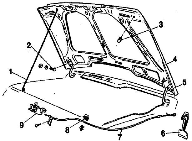 Рис. 8-15. Детали капота: 1 - упор капота; 2 - болты крепления капота; 3 - буфер; 4 - капот; 5 - петля капота; 6 - рукоятка привода замка капота; 7 - тяга привода; 8 - держатель упора; 9 - замок капота Привод замка тросовый, а рукоятка 6 замка располагается в салоне с левой стороны под панелью приборов. Для снятия капота отсоедините трубку омывателя ветрового стекла от тройника на капоте. Придерживая его, выверните четыре болта 2 крепления капота к петлям 5 и снимите его с кузова. При установке капота перед окончательным затягиванием болтов крепления отрегулируйте его положение в проеме кузова так, чтобы он имел одинаковые зазоры и находился в одной плоскости с правым и левым передними крыльями. Регулировка достигается за счет увеличенных отверстий в капоте под болты крепления к петлям 5, увеличенных отверстий в корпусе замка 9 капота и изменения положения буферов 3 по высоте. Для совпадения лицевых поверхностей капота и крыльев допускается изгибание петель 5. Если замок (рис. 8-16) капота работает ненадежно или затруднено открывание и закрывание капота, необходимо отрегулировать его положение. Для этого откройте капот, очертите контуры корпуса 6 замка, ослабьте гайки крепления, поставьте замок в нужное положение, затяните гайки и проверьте установку замка.