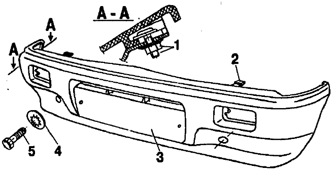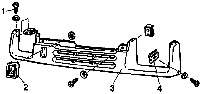 Рис. 8-17. Передний бампер: 1 - держатель с гайкой крепления; 2 - защелка; 3 - бампер; 4 - стопорная шайба; 5 - болт крепления Для снятия переднего бампера отсоедините электрические провода от указателей поворота, выверните болты переднего крепления и отверните гайки держателей 1 бокового крепления (держатели расположены с внутренней стороны бампера). Отведите защелки 2 и снимите бампер. Чтобы снять задний бампер, отсоедините электрические провода от фонарей освещения номерного знака, выверните (при открытой двери задка) гайки заднего крепления бампера и гайки держателей бокового крепления. Установку бамперов выполняйте в обратном порядке. Снятие и установка облицовки радиатора Облицовка 3 (рис. 8-18) радиатора изготавливается из морозостойкого полипропилена и крепится к передку кузова десятью самонарезающими винтами с помощью фланцевых гаек 4. К облицовке крепится заводской знак 2.