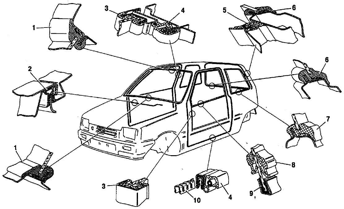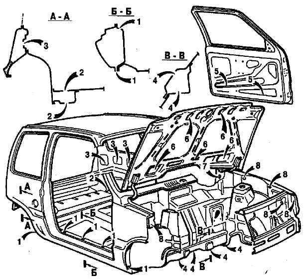 Рис. 8-5. Скрытые полости кузова: 1 - пороги пола; 2 - задние лонжероны; 3 - полости между наружными и внутренними панелями боковин по аркам колес; 4 - усилитель щитка передка; 5 - внутренние нижние поверхности передних дверец; 6 - карманы капота; 7 - полости между брызговиками и усилителями передних стоек; 8 - передние лонжероны Восстановление противокоррозионного и противошумного покрытия низа кузова и арок колес В процессе эксплуатации автомобиля предохраняющее покрытие на днище кузова подвергается воздействию гравия, песка, соли, влаги. В результате мастика и грунт постепенно стираются. Оголенный металл подвергается коррозии. В заводских условиях на днище, лонжероны и арки колес нанесена противошумная битумная мастика БПМ-1 толщиной 1-1,5 мм или пластизоль Д-11А толщиной 1-1,2 мм. При повреждениях защитного покрытия днища (без нарушения слоя грунта) поврежденные участки очистите от грязи, обезжирьте смоченной в уайт-спирите ветошью и кистью на сухую поверхность нанесите мастику БПМ-1 толщиной 1,5 мм. Высушите покрытие в естественных условиях в течение суток или 30 мин при температуре 90°С. При значительном повреждении защитного покрытия (с повреждением слоя грунта) очистите от грязи и ржавчины поврежденные участки поверхности до металла и на сухую обезжиренную поверхность нанесите грунт ГФ-073. На загрунтованные участки поверхности нанесите кистью мастику БПМ-1. При восстановлении нарушенного слоя пластизоля Д-11А, если срок эксплуатации автомобиля не превышает 1-1,5 года, наносите мастику БПМ-1 на соседние неповрежденные участки с минимальным перекрытием. При более длительной эксплуатации автомобиля с заводским покрытием днища мастику наносят по всей поверхности днища и арок колес. В холодное время года перед употреблением мастику выдержите в теплом помещении до повышения температуры не ниже 20°С. В случае загустения мастики аккуратно разбавьте ее ксилолом. Лакокрасочное покрытие, загрязненное мастикой, очищается уайт-спиритом. Герметизация кузова Герметизация обеспечивается применением резиновых уплотнителей (рис. 8-6), клеев, уплотнительных мастик, резиновых пробок, закрывающих технологические отверстия, и тщательной подгонкой сопрягаемых деталей. Снимая и устанавливая уплотнители с металлическими каркасами, не допускайте смятия каркаса и образования гофр на уплотнителях.