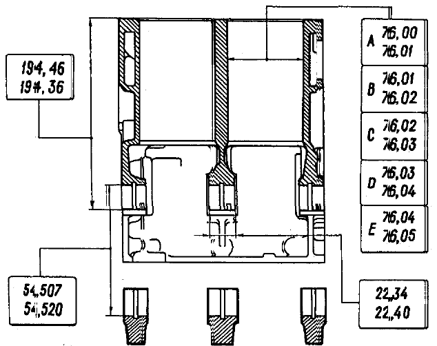 Особенности ремонта двигателяБЛОК ЦИЛИНДРОВ Основные размеры блока цилиндров даны на рис. 2-26. Блок цилиндров отлит из специального низколегированного чугуна. Диаметры цилиндров разбиты на пять классов через 0,01 мм, обозначаемых буквами А, В, С, D, E. Класс цилиндра клеймится на нижней плоскости блока цилиндров (рис. 2-27).