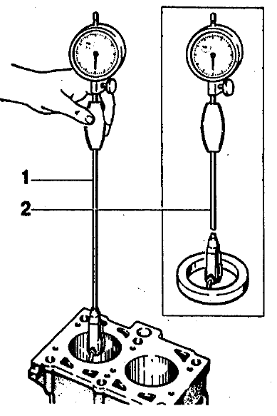 Рис. 2-28. Измерение цилиндров нутромером: 1 - нутромер; 2 - установка нутромера на ноль по калибру А.96137