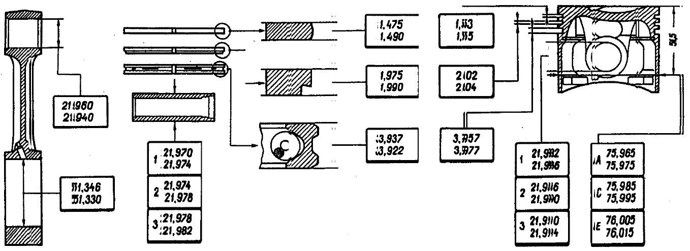Рис. 2-30. Основные размеры шатунно-поршневой группы Поршень - алюминиевый литой. По наружному диаметру поршни сортируются на пять классов (А, В, С, D, E) через 0,01 мм. Наружная поверхность поршня имеет сложную форму. Поэтому измерять диаметр поршня необходимо только в плоскости, перпендикулярной оси поршневого пальца на расстоянии 51,5 мм от днища поршня. По диаметру отверстия под поршневой палец поршни подразделяются на три класса (1, 2, 3) через 0,004 мм. Классы диаметров поршня и отверстия под поршневой палец клеймятся на днище поршня (рис. 2-31).