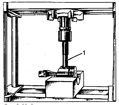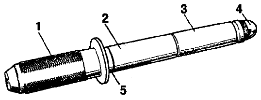 Рис. 2-34. Проверка посадки поршневого пальца Выпадающий палец замените другим, следующей категории. Если палец третьей категории выпадает из отверстия поршня, то замените поршень и повторите подбор пальца. Так как палец вставляется в верхнюю головку шатуна с натягом, необходимо нагреть шатун для расширения его головки. Для этого поместите шатуны на 15 мин в электропечь, нагретую до 240°С. Палец заранее приготовьте к сборке, надев его на валик 1 (рис. 2-35) приспособления А.60325 с установленным дистанционным кольцом 5. Кольцо должно иметь толщину 4 мм, наружный диаметр 22 мм и внутренний - 15 мм. На конце приспособления устанавливается направляющая 3, закрепляемая винтом 4. Винт затягивайте неплотно, чтобы не произошло заклинивания при расширении пальца от контакта с нагретым шатуном.