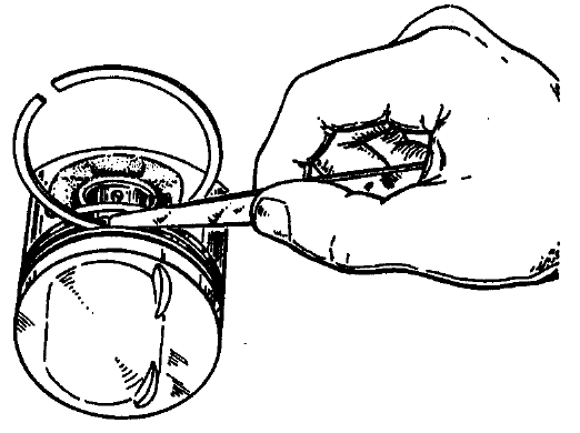 Рис. 2-36. Запрессовка поршневого пальца в верхнюю головку шатуна. Поршень должен опираться на головку шатуна в направлении, указанном стрелкой После остывания шатуна смажьте палец моторным маслом через отверстия в бобышках поршня. Смажьте моторным маслом канавки на поршне, поршневые кольца и установите кольца на поршень. Ориентируйте поршневые кольца так, чтобы замок верхнего компрессионного кольца располагался под углом 30-45° к оси поршневого пальца, замок нижнего компрессионного кольца - под углом приблизительно 180° коси замка верхнего компрессионного кольца, а замок маслосъемного кольца - под углом 30-45° к оси поршневого пальца между замками компрессионных колец. Нижнее компрессионное кольцо устанавливайте выточкой вниз (см. рис. 2-30). Если на кольце нанесена метка "Верх" или "ТОР", то кольцо устанавливайте меткой вверх (к днищу поршня). Перед установкой маслосъемного кольца проверьте, чтобы стык пружинного расширителя располагался со стороны, противоположной замку кольца. Проверка технического состояния Очистите поршень от нагара и удалите все отложения из смазочных каналов поршня и шатуна. Тщательно осмотрите детали. Трещины любого характера на поршне, поршневых кольцах, пальце, на шатуне и его крышке не допускаются. Если имеются глубокие риски на рабочей поверхности вкладышей - замените их новыми. Зазор между поршневыми кольцами и канавками проверяйте набором щупов, вставляя кольцо в соответствующую канавку, как показано на рис. 2-37. Расчетный зазор (округленный до 0,01 мм) для новых деталей составляет: для верхнего компрессионного кольца 0,04-0,07 мм; для нижнего - 0,03-0,06 мм и для маслосъемного - 0,02-0,05 мм. Предельно допустимые зазоры при износе - 0,15 мм.