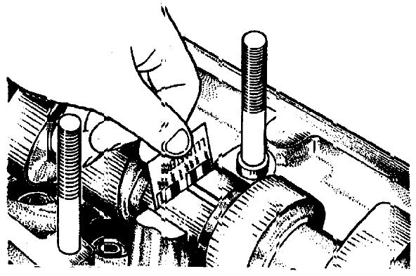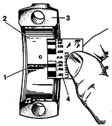 Рис. 2-40. Допустимые биения основных поверхностей коленчатого вала Смещение осей шатунных шеек от плоскости, проходящей через оси шатунных и коренных шеек, после шлифования должно быть в пределах +0,35 мм (см. рис. 2-40). Для проверки установите вал крайними коренными шейками на призмы и выставьте вал так, чтобы ось шатунной шейки первого цилиндра находилась в горизонтальной плоскости, проходящей через оси коренных шеек. Затем индикатором проверьте смещение в вертикальном направлении шатунной шейки 2-го цилиндра относительно шатунной шейки 1-го цилиндра. Прошлифовав шейки, отполируйте их с помощью алмазной пасты или пасты ГОИ. После шлифования и последующей доводки шеек удалите заглушки масляных каналов, а затем обработайте гнезда заглушек фрезой А. 94016/10, надетой на шпиндель А.94016. Тщательно промойте коленчатый вал и его каналы для удаления остатков абразива и продуйте сжатым воздухом. Оправкой А. 86010 запрессуйте новые заглушки, предварительно смазав герметиком УГ-6 гнезда заглушек. Зачеканьте каждую заглушку в трех точках кернером. На первой щеке коленчатого вала маркируйте величину уменьшения коренных и шатунных шеек (например, К 0,25; Ш 0,50). Вкладыши. На вкладышах нельзя производить никаких подгоночных операций. При задирах, рисках, или отслоениях замените вкладыши новыми. Зазор между вкладышами и шейками коленчатого вала проверяют расчетом (промерив детали). Удобно для проверки зазора пользоваться калиброванной пластмассовой проволокой. В этом случае метод проверки следующий: - тщательно очистите рабочие поверхности вкладышей, соответствующей шейки и положите отрезок пластмассовой проволоки на ее поверхность; - установите на шейке шатун с крышкой или крышку коренного подшипника (в зависимости от вида проверяемой шейки) и затяните гайки или болты крепления моментами, указанными в приложении I; - снимите крышку и по нанесенной на упаковке шкале (по ширине сплющенной проволоки) определите величину зазора (рис. 2-41).