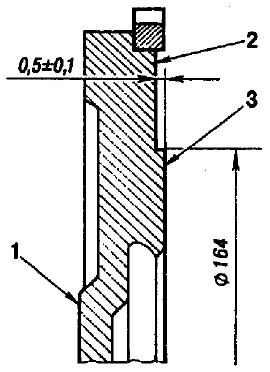 Рис. 2-42. Маховик: 1 - поверхность, прилегающая к фланцу коленчатого вала; 2 - место проверки поверхности для крепления сцепления; 3 - место проверки биения опорной поверхности ведомого диска сцепления На поверхности 1 маховика, прилегающей к фланцу коленчатого вала, и на поверхности 3 под ведомый диск сцепления не допускаются царапины и задиры. Допуск неплоскостности поверхности 3-0,05 мм. Царапины и задиры на поверхности 3 удалите проточкой, снимая слой металла толщиной не более 1 мм. При этом проточите и поверхность 2, не затрагивая зубчатый обод и выдерживая размер 0,5+0,1 мм. При проточке необходимо обеспечить параллельность поверхностей 2 и 3 относительно поверхности 1. Допуск непараллельности не более 0,1 мм. Установите маховик на оправку, центрируя его по посадочному отверстию с упором на поверхность 1, и проверьте биение плоскостей 2 и 3. В местах, указанных стрелками на рис. 2-42, индикатор не должен показывать биений, превышающих 0,1 мм. Уравновешивающие валы и шестерни. Уравновешивающий вал для замены изношенных подшипников демонтируйте в следующем порядке: - снимите упорное полукольцо 1 (рис. 2-43), отвернув болты крепления; - с помощью технологического стержня выпрессуйте вал до выхода переднего подшипника 2 из гнезда блока цилиндров; - снимите передний подшипник с уравновешивающего вала; - извлеките из блока цилиндров стопорное кольцо 3 и выньте вал. Задний подшипник 5 извлекается из блока цилиндров после выпрессовки заглушки, закрывающей подшипник. Для установки уравновешивающего вала: - поставьте на герметике УГ-6 заглушку и запрессуйте задний подшипник в блок с помощью оправки в виде трубы длиной 100 мм с внутренним диаметром 30 и наружным - 50 мм; - вставьте задний конец уравновешивающего вала в задний подшипник; - установите в блок цилиндров стопорное кольцо 3; - запрессуйте в блок цилиндров передний подшипник 2 и закрепите его упорным полукольцом 1. На зубьях шестерен уравновешивающих валов не должно быть выкрашиваний, трещин и других повреждений.