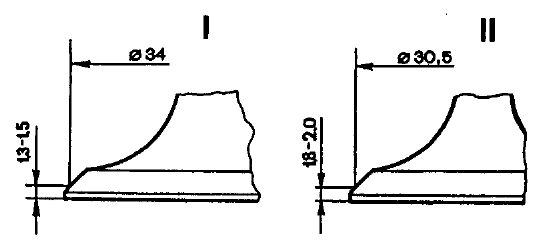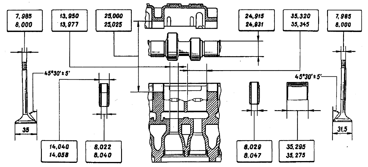 Рис. 2-53. Выпрессовка направляющих втулок оправкой Д.60153/К Запрессуйте направляющие втулки с надетым стопорным кольцом до упора его в тело головки цилиндров. После запрессовки разверните отверстия в направляющих втулках клапанов развертками А.90310/1 (для втулок впускных клапанов) и А.90310/2 (для втулок выпускных клапанов). Затем прошлифуйте седло клапана и, при необходимости, доведите ширину рабочей фаски до нужных размеров. Маслоотражательные колпачки направляющих втулок при ремонте двигателя, всегда заменяйте новыми. Поврежденные маслоотражательные колпачки заменяйте на снятой головке блока цилиндров. Для напрессовки колпачков пользуйтесь оправкой 41.7853.4016. Клапаны. Удалите нагар с клапанов. Проверьте, не деформирован ли стержень и нет ли трещин на тарелке. Поврежденный клапан замените. Проверьте состояние рабочей фаски клапана. При мелких повреждениях ее можно прошлифовать, выдерживая угол фаски 45°30'+5'. При этом расстояния от нижней плоскости тарелки клапана до базовых диаметров (34 и 30,5 мм) должны быть в пределах 1,3-1,5 и 1,8-2,0 мм (рис. 2-54).