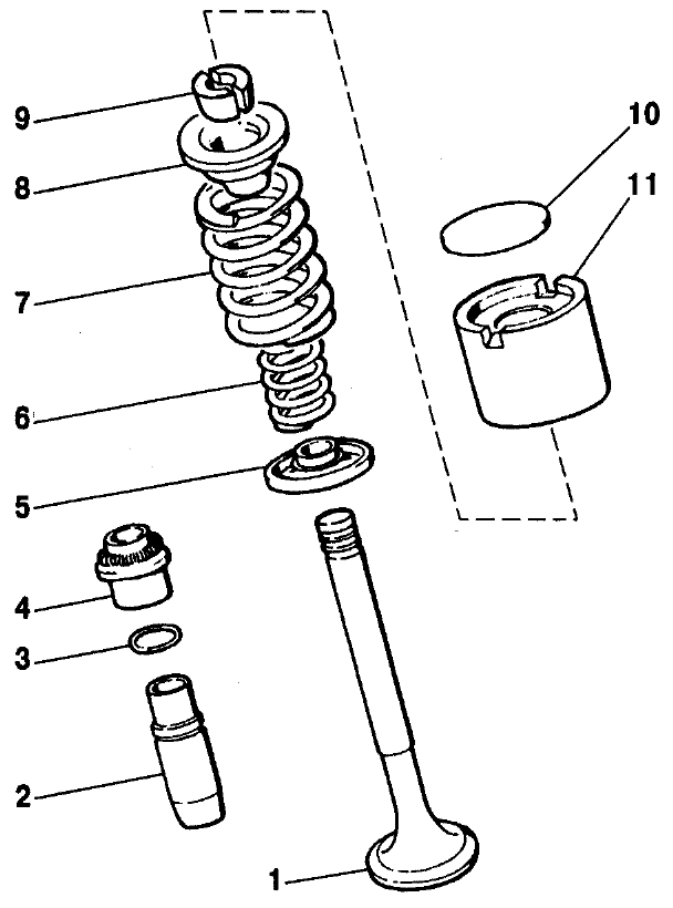 Рис. 2-47. Детали механизма привода клапанов: 1 - клапан; 2 - направляющая втулка; 3 - стопорное кольцо; 4 - маслоотражательный колпачок; 5 - опорная шайба пружин; 6 - внутренняя пружина; 7 - наружная пружина; 8 - тарелка пружин; 9 - сухари; 10 - регулировочная шайба; 11 - толкатель Сборка. Установите опорные шайбы пружин. Смажьте моторным маслом клапаны и новые маслоотражательные колпачки (старые использовать не допускается). Оправкой 41.7853.4016 напрессуйте на направляющие втулки колпачки. Вставьте клапаны в направляющие втулки, установите пружины и тарелки пружин. Сжимая пружины приспособлением 67.7823.9505 (см. рис. 2-48), установите сухари клапанов.