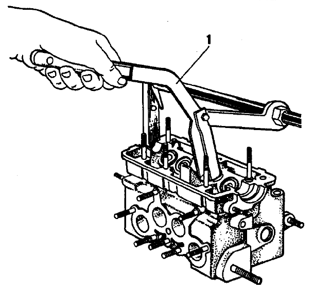 Рис. 2-48. Сжатие пружин клапанов: 1 - приспособление 67.7823.9505 Вставьте в отверстия головки цилиндров толкатели клапанов с регулировочными шайбами. Очистите сопрягающиеся поверхности головки блока цилиндров и корпуса подшипников от остатков старой прокладки, грязи и масла. Поставьте установочные втулки (рис. 2-49) корпусов подшипников распределительного вала. Смажьте моторным маслом опорные шейки и кулачки распределительного вала и уложите его в опоры головки цилиндров так, чтобы кулачки первого цилиндра были направлены вверх, а второго - вниз.