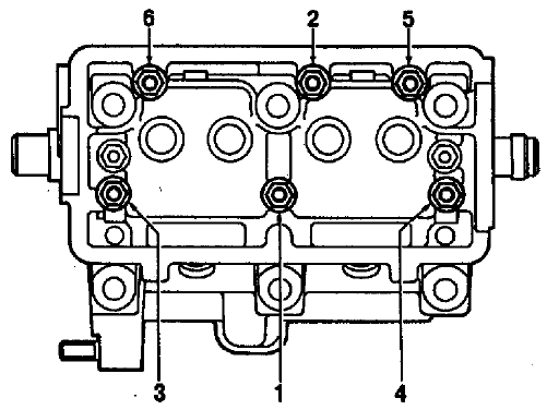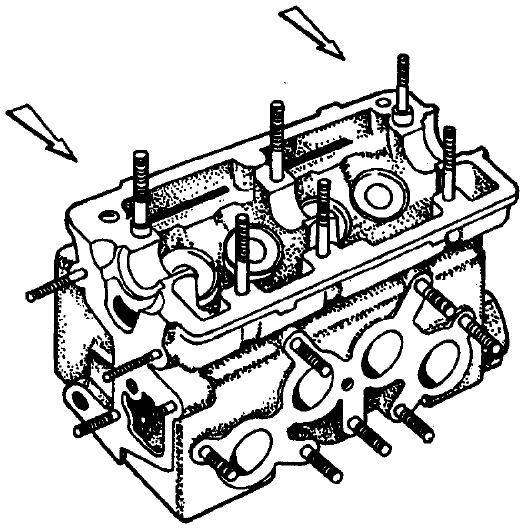 Рис. 2-50. Нанесение герметика на поверхность головки блока цилиндров Примечание. Запускать двигатель разрешается не ранее, чем через 1 ч после нанесения герметика. Установите корпус подшипников и затяните гайки его крепления в следующей последовательности: - предварительно затяните гайки (см. рис. 2-51) до прилегания поверхностей корпусов подшипников к головке цилиндров, следя за тем, чтобы установочные втулки корпуса свободно вошли в свои гнезда; - окончательно затяните гайки моментом 21,6 H·м (2,2 кгс·м) в том же порядке.