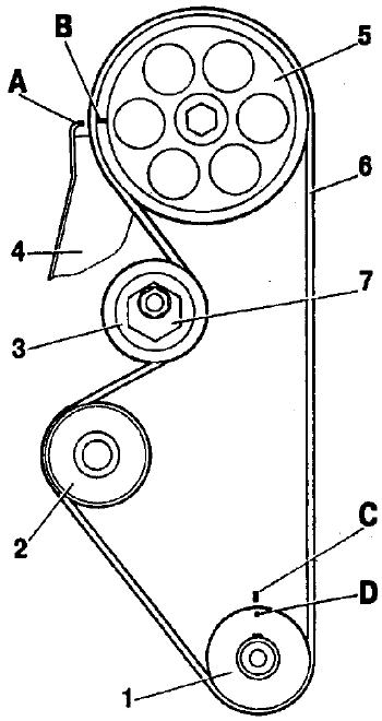 Рис. 2-58. Схема привода распределительного вала: 1 - зубчатый шкив коленчатого вала; 2 - зубчатый шкив насоса охлаждающей жидкости; 3 - натяжной ролик; 4 - задняя защитная крышка; 5 - зубчатый шкив распределительного вала; 6 - зубчатый ремень: 7 - ось натяжного ролика; А - установочный выступ на задней защитной крышке; В - метка на шкиве распределительного вала; С - метки на крышке масляного насоса; D - метка на шкиве коленчатого вала С 1995 г. на двигателе может устанавливаться натяжной ролик с пластмассовым ободом без оси 7 (непосредственно на шпильку). Чтобы установить новый ролик взамен старого (со стальным ободом), необходимо поставить новое дистанционное кольцо 5 (см. рис. 2-8). Его толщина 7+1 мм, наружный диаметр 28 мм и внутренний диаметр 10,1 мм. Кроме того, необходимо подложить под гайку крепления ролика более толстую шайбу, чтобы хватило длины резьбы на шпильке для затягивания гайки, либо заменить шпильку более короткой (с длиной выступающей части 40 мм). Регулировка натяжения ремня привода распределительного вала Натяжение зубчатого ремня является важным регулировочным показателем, обеспечивающим его высокую долговечность, отсутствие проскальзывания на зубьях шкивов и бесшумность в работе. Натяжение ремня проверяется и регулируется на холодном двигателе (температура двигателя и окружающей среды 15-30°С). Переведите рычаг коробки передач в нейтральное положение, откройте капот и снимите переднюю защитную крышку зубчатого ремня. Поверните коленчатый вал за болт крепления шкива привода генератора по часовой стрелке на два оборота. Натяжение ремня считается нормальным, если в средней части между шкивами распределительного и коленчатого валов ремень закручивается на 90° (рис. 2-59) усилием пальцев 15-20 H (1,5-2 кгс).