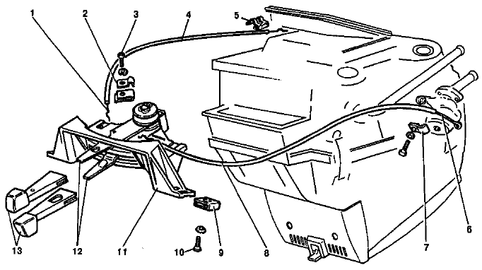 Рис. 8-26. Привод управления отопителем: 1 - гибкая тяга управления крышкой воздухопритока; 2,5,7 - прижимные скобы крепления оболочек гибких тяг; 3 и 10 - винты крепления; 4 и 8 - оболочки гибких тяг; 6 - гибкая тяга управления краном; 9 - пружинная гайка крепления кронштейна рычагов управления; 11 - кронштейн рычагов управления; 12 - рычаги управления отопителем; 13 - рукоятки рычагов управления Разборка и сборка Для разборки снятого отопителя: - отсоедините гибкие тяги 1 и 6 от крана и крышки воздухопритока, при необходимости ослабив винты прижимных скоб 2, 7 (см. рис. 8-26) крепления оболочек тяг, затем снимите скобу 5 и тяги в сборе с оболочками; - снимите четыре пружинные скобы 9 (рис. 8-27) и отсоедините кожух вентилятора от кожуха 4 радиатора; - снимите две пружинные скобы 20 и выньте электровентилятор из кожуха; - отверните гайку крепления крыльчатки 17 и снимите крыльчатку с электродвигателя 18; - отверните гайку и снимите скобу крепления подводящей и отводящей трубок; - снимите кран 14 радиатора, отвернув гайки крепления и выньте из кожуха 4 радиатор 12. Сборку отопителя выполняйте в обратной последовательности. Перед сборкой обратите внимание на правильность установки уплотнительных прокладок и на надежность затягивания стяжных хомутов резиновых шлангов.