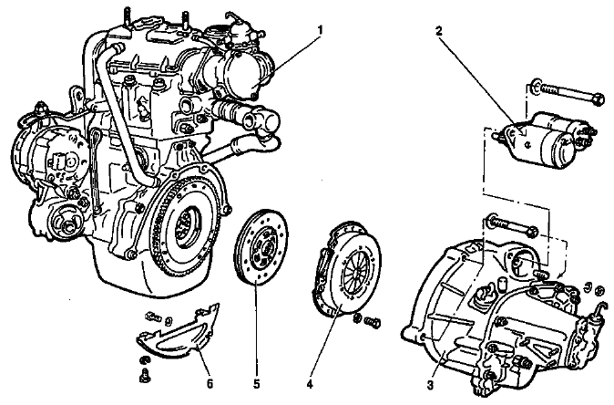 Рис. 2-5. Разборка силового агрегата: 1 - двигатель; 2 - стартер; 3 - коробка передач; 4 - кожух сцепления; 5 - ведомый диск; 6 - нижняя крышка картера сцепления Отверните болт и гайку крепления стартера 2 (рис. 2-5) и снимите его. Снимите кронштейны 1 (см. рис. 2-3), 3 с опорами левой и задней подвески силового агрегата, а также нижнюю крышку 6 (см. рис. 2-5) картера сцепления, отвернув болты крепления. Осторожно отсоедините коробку передач от двигателя, стараясь не опирать первичный вал коробки передач на лепестки нажимной пружины сцепления. Отсоедините от маховика кожух 4 сцепления с ведомым диском 5.