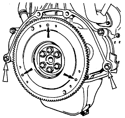 Рис. 2-6. Установочные шрифты сцепления (черные стрелки) и центрирующие втулки коробки передач (белые стрелки) Сборка. Установите на маховике по трем центрирующим штифтам (рис. 2-6) кожух сцепления с ведомым диском, отцентрируйте оправкой 67.7853.9597 (см. рис. 3-3) ведомый диск сцепления и закрепите кожух сцепления болтами. Нанесите тонкий слой смазки ЛСЦ-15 или ШРУС-4 на шлицевой конец первичного вала коробки передач и на наружную поверхность направляющей втулки муфты выключения сцепления. Соедините коробку передач с двигателем, стараясь не давить первичным валом на лепестки нажимной пружины сцепления. Установите нижнюю крышку картера сцепления и закрепите ее болтами. Смажьте моторным маслом переднюю втулку вала якоря стартера, расположенную в картере сцепления. Установите и закрепите стартер. Установите и закрепите два кронштейна с опорами левой и задней подвески силового агрегата, а также приемную трубу глушителей с кронштейном. |