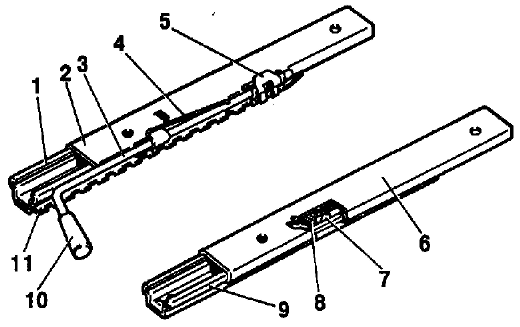 Рис. 8-25. Салазки переднего сиденья: 1 - внутренняя направляющая; 2 - внутренний ползун; 3 - ось защелки; 4 - пружина защелки; 5 - защелка салазок; 6 - наружный ползун; 7 - ролик; 8 - ограничитель; 9 - наружная направляющая; 10 - рукоятка защелки салазок; 11 - фиксатор Передние сиденья. Для снятия сиденья передвиньте его до отказа назад и выверните болты крепления направляющих салазок к полу кузова. Затем передвиньте сиденье до отказа вперед, выверните болты крепления направляющих к полу и снимите сиденье в сборе с салазками. Установку сиденья выполняйте в обратном порядке. Для разборки механизма передвижения выверните болты крепления ползунов 2 и 6 (см. рис. 8-25) к каркасу подушки и снимите салазки. Сдвиньте ползуны, выньте ролики 7 и ограничитель 8. Сборку выполняйте в обратном порядке. Заднее сиденье. Для снятия сиденья отверните две гайки крепления петель подушки к кронштейнам пола кузова, нажмите на рукоятки замков спинки вверх и выведите их из зацепления с фиксатором. Наклоном вперед уложите спинку в горизонтальное положение, затем поставьте его вертикально и выньте из салона автомобиля. Установку заднего сиденья выполняйте в обратной последовательности. |