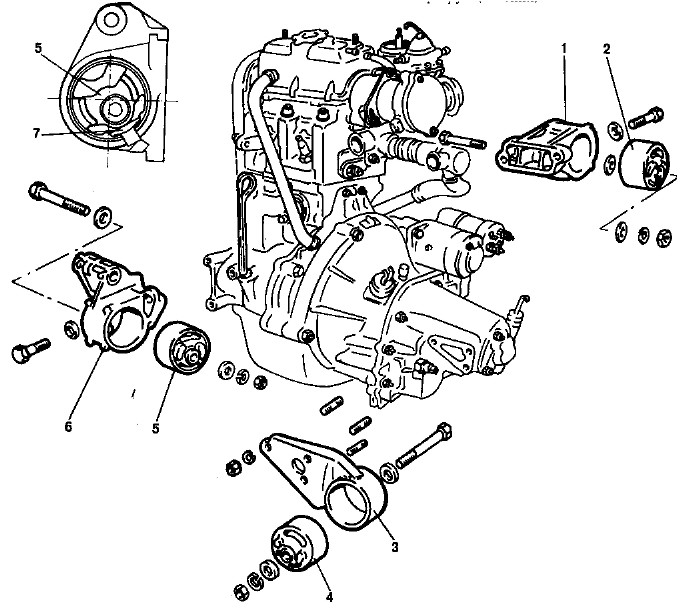 Рис. 2-3. Подвеска силового агрегата: 1 - кронштейн задней опоры; 2 - задняя опора подвески; 3 - кронштейн левой опоры, 4 - левая опора подвески; 5 - передняя опора подвески; 6 - кронштейн передней опоры; 7 - ограничитель Снимают силовой агрегат вместе с подрамником при помощи гидроподъемника или тали. При этом валы привода передних колес отсоединяются от колес и снимаются вместе с силовым агрегатом. Снятие силового агрегата производите в следующем порядке. Поставьте автомобиль на подъемник и затормозите его ручным тормозом. Установите упоры под задние колеса, вывесите передние колеса, откройте и снимите капот (если двигатель будет сниматься с помощью тали). Снимите запасное колесо и отсоедините провод от отрицательного вывода аккумуляторной батареи. Поднимите автомобиль на удобную для работы высоту и снимите брызговики двигателя, отвернув болты их крепления к кузову. Слейте охлаждающую жидкость, отвернув сливные пробки блока цилиндров и радиатора при снятой крышке расширительного бачка и открытом кране отопителя. Опустите автомобиль. Отсоедините провода от стартера, генератора, датчиков температуры и давления масла, выключателя света заднего хода, электромагнитного клапана карбюратора и датчика момента искрообразования. Снимите провода высокого напряжения, отсоединив их от свечей и катушки зажигания. Отсоедините провод "массы" от силового агрегата, отвернув гайку крепления наконечника провода к картеру сцепления. Снимите воздушный фильтр, отсоединив шланг системы вентиляции картера от крышки головки блока цилиндров, а шланг подачи теплого воздуха - от заборника теплого воздуха. Закройте карбюратор сверху технологической крышкой. Отсоедините от топливного насоса шланг подачи топлива, а от впускной трубы - шланг вакуумного усилителя тормозов. Отсоедините от двигателя шланги, идущие к радиатору и расширительному бачку, а от патрубков отопителя - шланги, идущие к отопителю. Отсоедините от двигателя тросы привода воздушной и дроссельных заслонок карбюратора, а от коробки передач - трос привода сцепленной гибкий вал привода спидометра. Примите меры, чтобы при снятии силового агрегата не произошло резких перегибов вала. Если силовой агрегат снимается с помощью тали, то зацепите его за рымы, установленные на головке блока цилиндров и коробке передач (рис. 2-4). Поднимите автомобиль на подъемнике, одновременно подтягивая цепь тали, чтобы силовой агрегат оставался подвешенным.