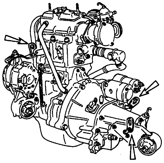 Рис. 2-4. Рымы для подвешивания силового агрегата при его снятии (указаны стрелками) Отсоедините тягу привода рычага переключения передач от шарнира штока выбора передач, отвернув болт хомута, и реактивную тягу от коробки передач. Отверните болты, стягивающие фланцы приемной трубы и трубы глушителей. Выньте уплотнительное кольцо, находящееся между фланцами. Отсоедините от поворотных кулаков шаровые шарниры рычагов подвески. Отверните гайки хомутов крепления рулевого механизма и отсоедините его от подрамника. Отверните гайки крепления наконечников валов привода передних колес к ступицам и выведите наконечники из зацепления со ступицами колес. Если силовой агрегат снимается с помощью специальной тележки с гидроподъемником, то подведите ее под автомобиль и поднимите опорные кронштейны гидроподъемника до упора в подрамник. Отверните болты крепления подрамника к кузову и опустите силовой агрегат с подрамником вниз. Если применяется таль, то понемногу перемещая цепь тали, осторожно опустите силовой агрегат с подрамником на тележку. Отверните болты крепления опор подвески силового агрегата к подрамнику и снимите силовой агрегат с подрамника. Устанавливайте силовой агрегат в порядке, обратном снятию. После установки проверьте и отрегулируйте в соответствии с указаниями соответствующих глав приводы воздушной и дроссельной заслонок карбюратора, механизмы выключения сцепления и переключения коробки передач, а также углы установки передних колес. |