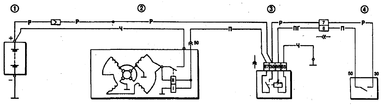 Рис. 7-13. Схема соединений стартера: 1 - аккумуляторная батарея, 2 - стартер; 3 - реле включения стартера; 4 - выключатель зажигания ВОЗМОЖНЫЕ НЕИСПРАВНОСТИ, ИХ ПРИЧИНЫ И МЕТОДЫ УСТРАНЕНИЯ
