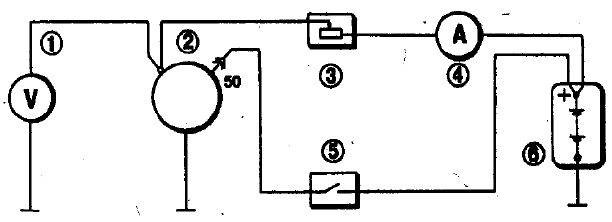 Рис. 7-14. Схема соединений для проверки стартера на стенде: 1 - вольтметр с пределом шкалы не менее 15В; 2 - стартер; 3 - реостат на 800 А; 4 - амперметр с шунтом на 1000 А; 5 - выключатель; 6 - аккумуляторная батарея Проверка работоспособности Замыкая выключатель 5 (рис. 7-14), при напряжении 12 В три раза включите стартер с разными условиями торможения. Например, при тормозных моментах 1,5; 3 и 5 Н·м (0,15; 0,31 и 0,51 кгс·м). Длительность каждого включения стартера должна быть не более 5 с, а промежутки между включениями не менее 5 с. Если стартер не вращает зубчатый венец стенда или его работа сопровождается ненормальным шумом - разберите стартер и проверьте его детали. Испытание в режиме полного торможения Затормозите зубчатый венец стенда, включите стартер и замерьте ток, напряжение и тормозной момент. Для исправного стартера они должны быть соответственно не более 310 А, не более 5 В и не менее 7 Н·м (0,715 кгс·м). Длительность включения стартера должна быть не более 5 с. Если тормозной момент ниже, а сила тока выше - причиной этому может быть межвитковое замыкание в обмотке статора и якоря или замыкание обмоток на массу. Если тормозной момент и потребляемая сила тока ниже - причиной может быть окисление и загрязнение коллектора, сильный износ щеток или снижение упругости их пружин, зависание щеток в щеткодержателях, ослабление крепления выводов обмотки статора, окисление или подгорание контактных болтов тягового реле. При полном торможении якорь стартера не должен проворачиваться. Если это происходит - неисправна муфта свободного хода. Для устранения неисправностей разберите стартер и замените или отремонтируйте поврежденные детали. Испытание на режиме холостого хода Выведите зубчатый венец стенда из зацепления с шестерней стартера. Включите стартер и замерьте потребляемый ток и частоту вращения якоря стартера, которые должны быть соответственно не более 60 А и 6200 мин-1 при напряжении на клеммах стартера 11,5-12 В. Если сила тока и частота вращения вала якоря отличаются от указанных значений - причины неисправностей могут быть те же, что и в предыдущем испытании. Проверка тягового реле Установите между ограничительным кольцом 1 (см. рис. 7-12) и шестерней прокладку толщиной 12,3 мм и включите реле. Напряжение включения реле при упоре шестерни в прокладку должно быть не более 9 В при температуре окружающей среды 20+5°С. Если напряжение больше - это указывает на неисправность реле или привода. Реле включения стартера Напряжение включения реле должно быть не более 8 В при температуре 23+5°С. Сопротивление обмотки реле при 20°С - 85+8,5 Ом. Ремонт стартера Разборка. Отверните гайку нижнего контактного болта тягового реле 8 (рис. 7-15) и отсоедините от него вывод обмоток статора. Отверните винты крепления тягового реле и снимите его. Отсоедините якорь 7 реле от рычага 6 привода. Выньте резиновую заглушку с шайбой из передней крышки. Выверните стяжные болты 13, снимите кожух 12 и переднюю крышку 5 с рычагом 6. Выньте пружины 10 щеток из щеткодержателя. Отверните гайку оси 4 рычага и выньте из крышки ось и рычаг 6. Снимите с вала якоря стопорную шайбу 11 и выньте якорь 17 из корпуса 16. Отсоедините от задней крышки корпус 16 вместе с "положительными" щетками 15, припаянными к выводу сериесных обмоток статора. "Отрицательные" щетки (соединенные с массой) остаются в щеткодержателе. Снимите стопорное 