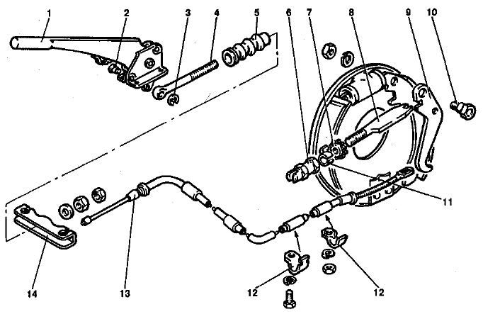 Рис 6-21. Детали привода стояночной тормозной системы: 1 - рычаг привода стояночного тормоза; 2 - палец; 3 - стоповая шайба; 4 - тяга; 5 - защитный чехол; б - упор колодки; 7 - регулировочная гайка; 8 - разжимная планка колодок; 9 - рычаг ручного привода колодок; 10 - ось рычага; 11 - фиксатор гайки; 12 - скоба крепления троса; 13 - трос; 14 - уравнитель тросов Отверните болты крепления кронштейна рычага 1 к полу кузова и снимите его в сборе с кронштейном. Установку деталей стояночной тормозной системы проводите в последовательности, обратной снятию. При установке смажьте смазкой Литол-24 ось рычага стояночного тормоза, передний и задний наконечники троса, соединительный палец тяги. Обратите внимание, чтобы буртик заднего наконечника оболочки троса плотно прилег к щиту тормоза. Проверка деталей Тщательно проверьте состояние деталей стояночной тормозной системы. Если обнаружены обрыв, перетирание проволок троса, плохое крепление наконечников или повреждение оболочки -трос замените новым. Убедитесь, что зубья сектора и защелки не повреждены и рычаг надежно фиксируется как в заданном положении, так и легко перемещается вверх-вниз. Поврежденные и изношенные детали замените. |