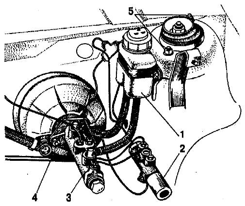 Рис. 6-10. Расположение на автомобиле вакуумного усилителя, главного цилиндра с бачком и регулятора давления: 1 - бачок главного цилиндра; 2 - регулятор давления; 3 - главный цилиндр; 4 - вакуумный усилитель; 5 - гайки крепления верхней опоры стоики подвески |