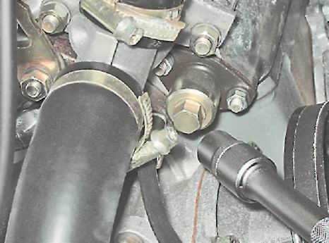 Цепь привода газораспределительного механизма - регулировка натяженияХарактерным признаком недостаточного натяжения цепи служит дребезжащий звонкий звук, появляющийся при резком повышении и последующем понижении оборотов коленчатого вала. Вследствие износа шарниров, цепь со временем вытягивается. Кроме цепи изнашиваются также и звездочки ее привода. В совокупности это приводит к уменьшению натяжения цепи и, как следствие, смещению фаз газораспределения. Натяжение цепи регулируется ослаблением затяжки колпачковой гайки плунжерного натяжителя, установленного под выпускным патрубком системы охлаждения. Для визуального контроля работы натяжителя регулировку натяжения цепи проводим при снятой крышке головки блока цилиндров (см. "Прокладка крышки головки блока цилиндров - замена"). Если нет сомнений в исправности натяжителя, крышку снимать не нужно. Последовательность выполнения 1. Подготавливаем автомобиль к выполнению работы (см. "Подготовка автомобиля к ТО и ремонту"). 2. Торцовым ключом на 13 мм ослабляем колпачковую гайку натяжителя ("разряжаем" натяжитель), при этом его башмак должен переместиться, натягивая цепь.