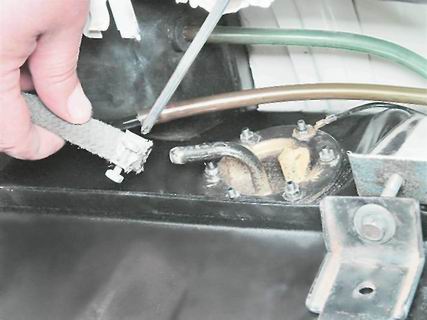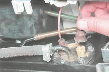 3. Предварительно пометив расположение, сдвигаем защитные колпачки и отсоединяем наконечники проводов от выводов датчика указателя уровня и резерва топлива. Серо-красный провод соединяется с правым выводом датчика, а розовый - с левым (направление взгляда со стороны багажника).