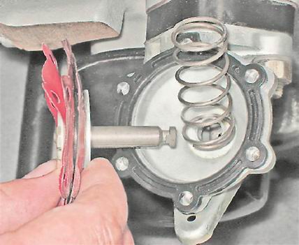 5. Нажимаем на тарелку диафрагменного узла и, поворачивая шток на 90°, выводим его из зацепления с вилкой балансира. Вынимаем шток с диафрагменным узлом из отверстия корпуса и снимаем пружину.