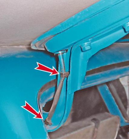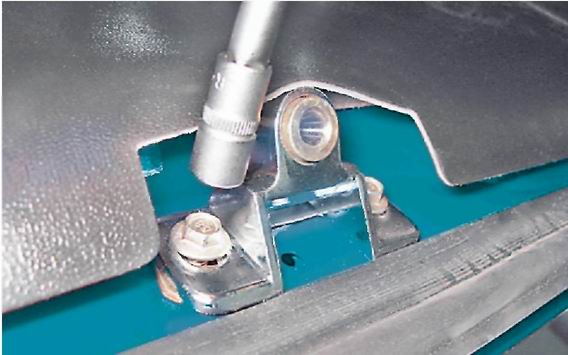 6. Вытягиваем жгут проводов. 7. Удерживая дверь багажного отделения, ключом на 13 мм отворачиваем два болта ее крепления к петлям кузова.