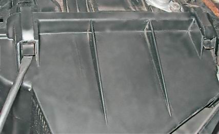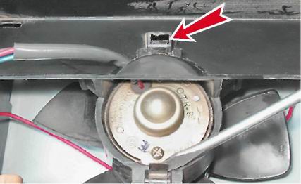 Электродвигатель вентилятора отопителя - заменаСнятие 1. Подготавливаем автомобиль к выполнению работы (см. "Подготовка автомобиля к ТО и ремонту"). 2. Отсоединяем провод от отрицательного вывода аккумуляторной батареи (см. "Аккумуляторная батарея - снятие и установка"). 3. Отсоединяем провода от переключателя режимов работы вентилятора отопителя (см. "Комбинация приборов - снятие и установка"). 4. Торцовым ключом на 10 мм отворачиваем гайку крепления кожуха радиатора и наконечника "массового" провода вентилятора, расположенных за панелью приборов (см. "Кран и радиатор отопителя - замена"). 5. Снимаем со шпильки наконечник "массового" провода. 6. Шлицевой отверткой поддеваем и отсоединяем с двух сторон четыре пружинные скобы крепления кожухов вентилятора к кожуху радиатора.