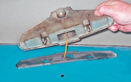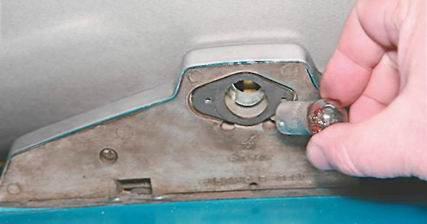 Фонарь освещения заднего номерного знака - замена лампы, снятие и установкаВ фонаре освещения номерного знака установлена лампа А12-5 (T5W). 1. Подготавливаем автомобиль к выполнению работы (см. "Подготовка автомобиля к ТО и ремонту"). 2. Отсоединяем провод от отрицательного вывода аккумуляторной батареи (см. "Аккумуляторная батарея - снятие и установка"). Замена лампы 3. Крестовой отверткой отворачиваем два винта крепления держателя плафона фонаря.