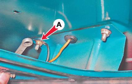 Снятие 6. Для снятия фонаря снимаем обивку двери багажного отделения (см. "Дверь багажного отделения - снятие и установка"). 7. Ключом на 8 мм отворачиваем две гайки крепления фонаря. Под гайкой А находится "массовый" провод.