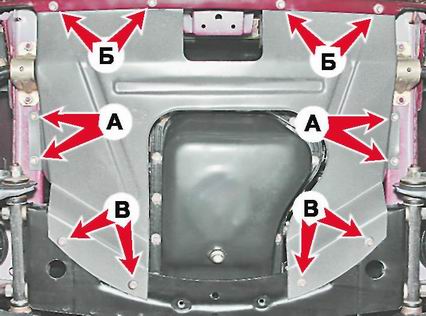 2. Торцовым ключом на 8 мм отворачиваем четыре самореза А бокового крепления, четыре самореза Б переднего крепления и четыре болта В заднего крепления грязезащитного щитка.