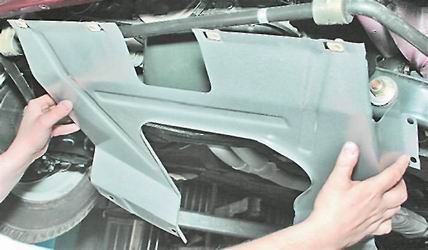Грязезащитный щиток снимаем для проведения работ снизу моторного отсека.