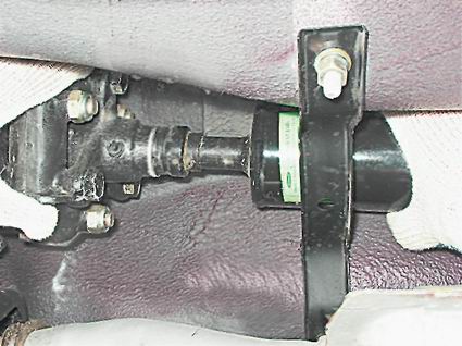 6. Осматриваем эластичную муфту и промежуточную опору переднего карданного вала. При отслоениях резины от металла, трещинах и разрывах муфту и (или) промежуточную опору необходимо заменить. 7. Шлицевое соединение кардан ного вала требуется регулярно смазывать (см. "Периодическое техническое обслуживание"). Для этого ключом на 11 мм отворачиваем пробку и вместо нее устанавливаем пресс-масленку.
