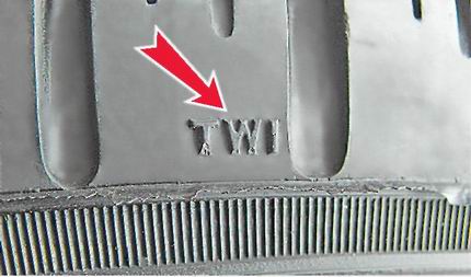 3. Для визуального контроля износа протектора в его продольных канавках выполнены индикаторы в виде выступов, имеющих высоту 1,6 мм. В месте нахождения индикаторов на боковине шины выполнены метки в виде букв TWI или треугольника "Δ".