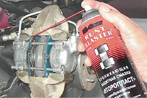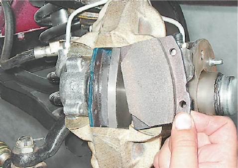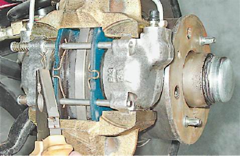 Колодки тормозных механизмов передних колес - заменаВнимание! Колодки заменяем комплектом с обеих сторон автомобиля. Периодически проверяйте состояние накладок тормозных колодок (см. "Тормозная система - проверка технического состояния") и заменяйте их, не допуская износа накладок до толщины менее 1,5 мм. Работа показана на тормозном механизме правого колеса. Снятие 1. Подготавливаем автомобиль к выполнению работы (см. "Подготовка автомобиля к ТО и ремонту"). 2. Проверяем уровень тормозной жидкости в бачке. Если уровень находится на метке "МАХ", отбираем грушей часть жидкости из бачка во избежание ее выплескивания при вдавливании поршней в цилиндры. 3. Снимаем переднее колесо (см. "Колесо - замена"). 4. Ветошью очищаем от грязи тормозной механизм и наносим на направляющие пальцы проникающую смазку с преобразователем ржавчины.