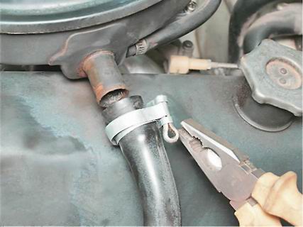 Корпус воздушного фильтра - снятие и установкаСнятие 1. Подготавливаем автомобиль к выполнению работы (см. "Подготовка автомобиля к ТО и ремонту"). 2. Очищаем от грязи корпус воздушного фильтра. 3. Плоскогубцами ослабляем хомут крепления шланга отвода картерных газов.