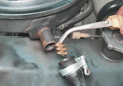 5. Промываем пламегаситель в ацетоне. 6. Ослабив хомут крепления шланга воздухозаборника теплого воздуха, снимаем шланг с патрубка.